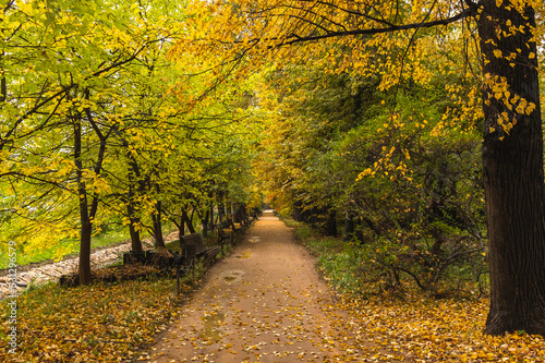 © Natalia, Fototapeta premium An alley in an autumn park covered with yellow leaves on a cloudy day.