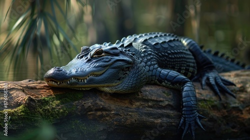 © Fotograf, Obraz premium An alligator lays on a log in a natural habitat