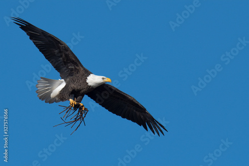 Obraz premium An American Bald Eagle in flight with nesting material.