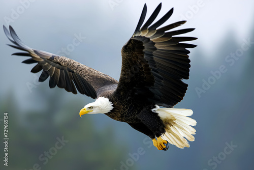 Obraz premium An American bald eagle in mid-flight, wings fully extended, with a focused gaze, over a misty forested background.