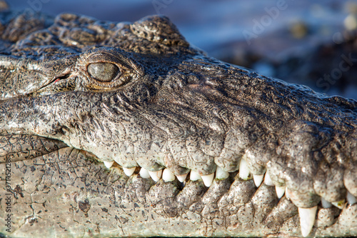 © ead72, Obraz premium An American crocodile, Crocodylus acutus, lurks at the water's edge in the Caribbean Sea in Belize. These dangerous and sneaky predators can reach lengths of over 15 feet.