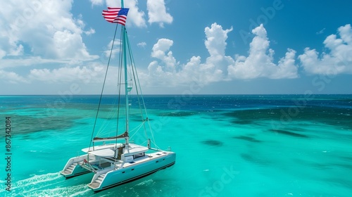 © Sana, Naklejka premium An American flag flying from a tall mast on a catamaran sailing through turquoise waters.
