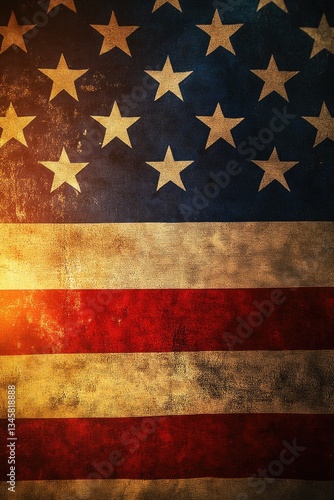 © Fotograf, Fototapeta premium An American flag waving with the sun shining brightly behind it
