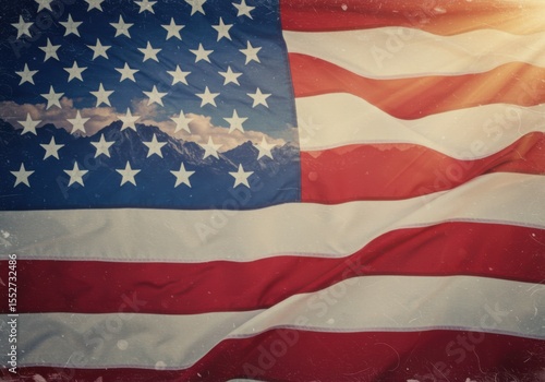 © Habibur, Obraz premium An american flag with mountains and clouds on the star field