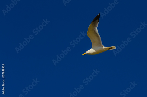 Fototapeta premium An American herring gull flying against a dark blue sky at Grand Haven, Michigan
