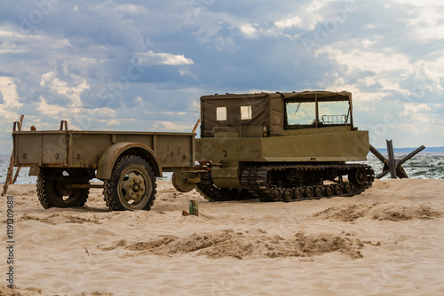 © krysek, Obraz premium An American World War II-era Weasel light tracked transporter on the beach
