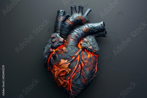 Naklejka premium An anatomical heart wreathed in vibrant flames, partially scorched and...