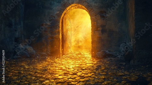Fototapeta premium An ancient arched stone doorway leading to a glowing path of gold coins, illuminated by soft golden light, mysterious and magical