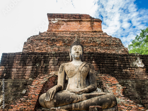 Fototapeta premium An ancient buddha statue at Mahathat Temple in Sukhothai Historical Park,...