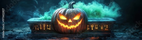 Naklejka premium An ancient Egyptian sarcophagus with a carved pumpkin face, eerie green smoke escaping, glowing hieroglyphics, fantasy illustration, dark theme, copy space for text