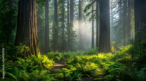 Obraz premium An ancient forest with towering redwoods, mist, and a lush understory.