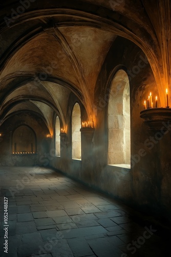 Fototapeta premium An ancient hallway with arches, warm candlelight, and a tranquil ambiance.
