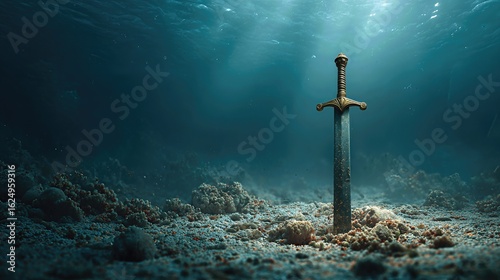 Naklejka premium An ancient knight’s sword juts from the seabed, weathered by time and waves, hinting at forgotten battles beneath the sea.