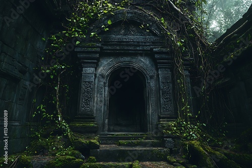 Fototapeta premium An ancient stone temple entrance overgrown with jungle vines