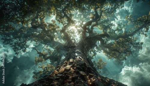 © Nattanon, Fototapeta premium An ancient tree bathed in sunlight