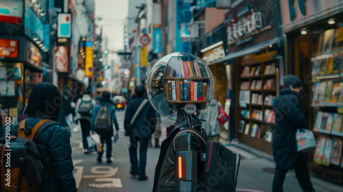 © Natallia, Fototapeta premium An android with a three-dimensional library head walking around the city, against the blurry background of a bookstore window