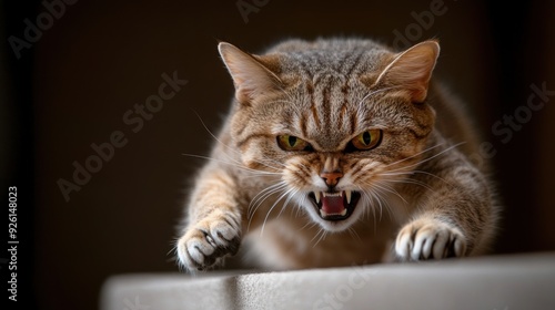 © Thi, Fototapeta premium An angry cat hissing with claws extended, illustrating defensive behavior.