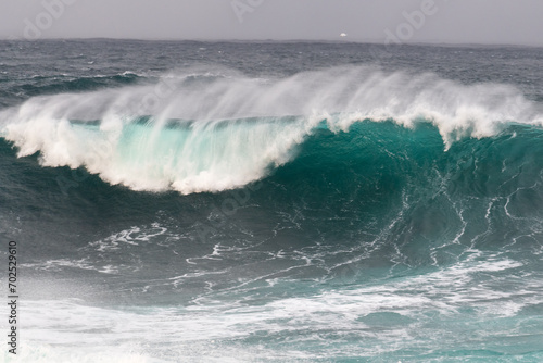 Fototapeta premium An angry turquoise green colour massive rip curl of a wave as it rolls along a beach. The white mist and froth from the wave are foamy and fluffy. The Atlantic Ocean in the background is deep blue.