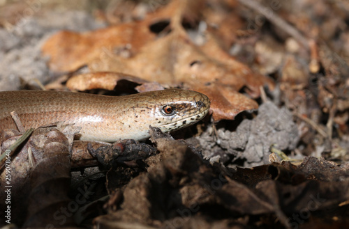 Obraz premium An Anguis fragilis, or slow worm warming up on the ground in the sun before...