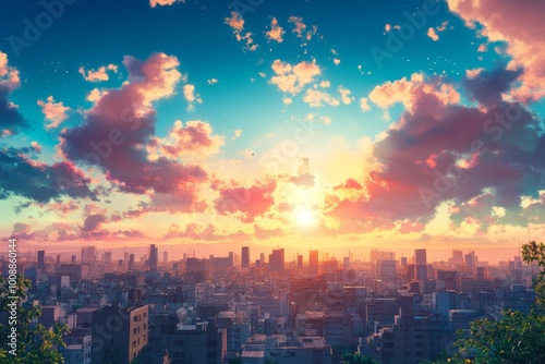 © mfv, Obraz premium An anime cinematic scene blending urban and suburban landscapes with natural elements and fantasy architecture, creating an exciting adventure in a visually captivating world