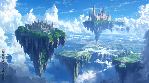 Fototapeta premium An anime fantasy world with floating islands and a grand castle in the...