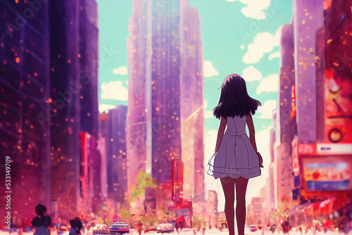 © Japanese_Brush, Obraz premium an anime girl standing in front of a big city, colorful manga art