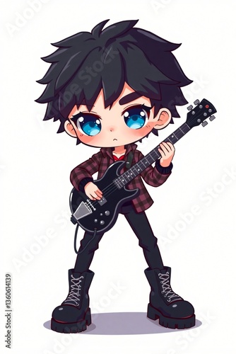 Obraz premium An anime style boy playing a black electric guitar enthusiastically