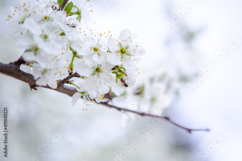 © Елена Дроздова, Fototapeta premium An ant on a branch with white flowers