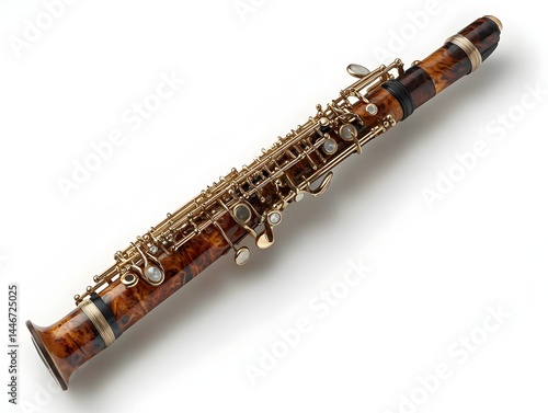 © CHAIYAPHON, Naklejka premium An antique oboe with intricate gold detailing and rich brown wood lies on a pristine white background.