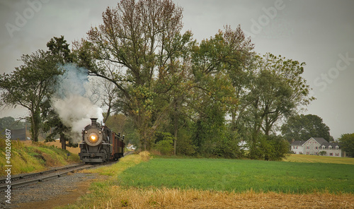 © Greg Kelton, Obraz premium An Antique Restored Steam Freight Train Approaching Head on Blowing Smoke and Steam