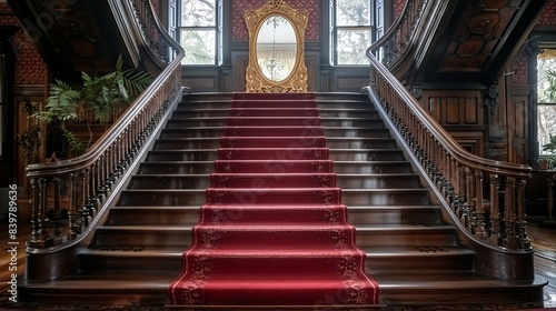 © DARIKA, Obraz premium An antique staircase with a red carpet runner, bordered by intricate wooden railings, leading up to a landing with a large mirror framed in gold leaf. shiny, Minimal and Simple,