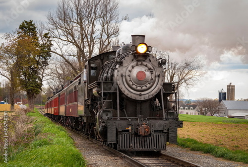 © Greg Kelton, Obraz premium An Antique Steam Passenger Train Approaching on a Single Track Blowing Smoke on a Cloudy Day