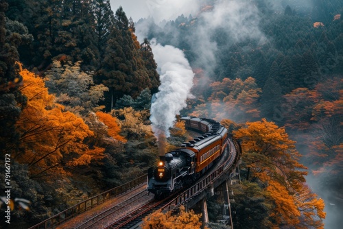 © AI Dev Studio, Fototapeta premium An antique steam train billowing thick smoke, traverses a bridge with a fiery autumn forest backdrop