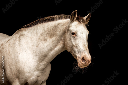 © Annabell Gsödl, Obraz premium An appaloosa horse mare in front of black studio background. Black shot portrait of a horse