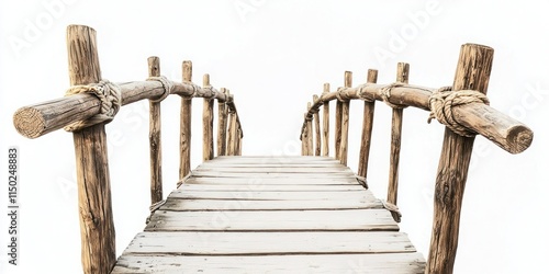© Samady, Fototapeta premium An arch rustic wooden wood suspended rope suspension bridge entrance footbridge boardwalk on white background. Mockup template for design