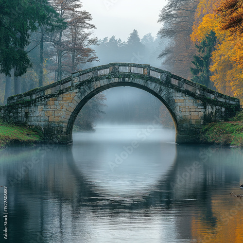 Fototapeta premium An arched bridge over a tranquil autumn lake.