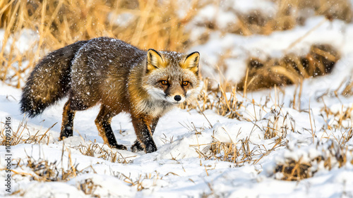 Fototapeta premium An arctic fox halfway through its winter-to-spring coat transition, with half-white, half-brown fur blending into a snowy and earthy landscape, with text space in the open snow area