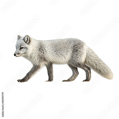 Obraz premium An arctic fox walks gracefully across a snowy landscape on transparent...