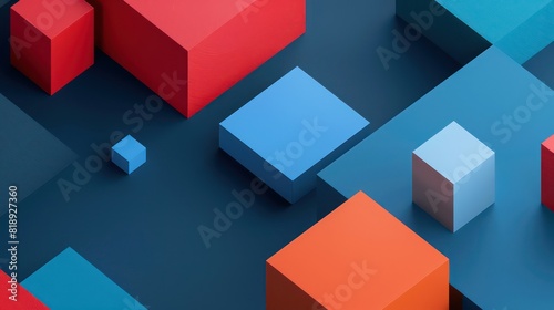© Matthew, Fototapeta premium An array of blue and red geometric shapes on a matte surface, creating a visually appealing pattern with a three-dimensional effect