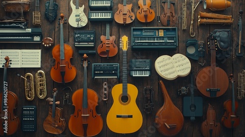 Naklejka premium An Array of Musical Instruments Hanging on a Wooden Wall