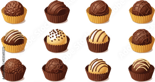© Wajid, Fototapeta premium An array of twelve chocolate truffles with various designs and wrappers on a plain white background