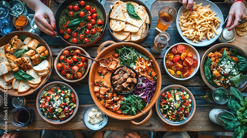 Fototapeta premium An array of vegetarian dishes served on a wooden table, perfect for a group...
