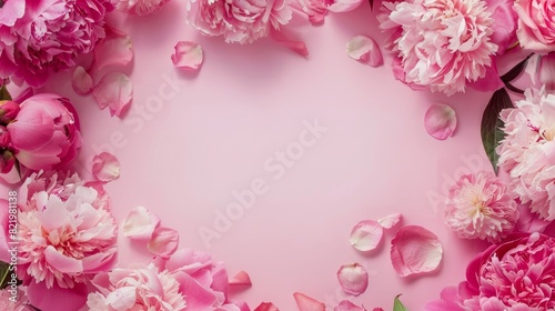 Obraz premium An artful arrangement of peonies and roses on a pink background. Abstract layout of natural flowers with text space. A romantic feminine composition suitable for wedding invitations. International