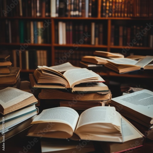 Fototapeta premium An Artistic Arrangement of Open Books on a Wooden Table Surrounded by Stacks...