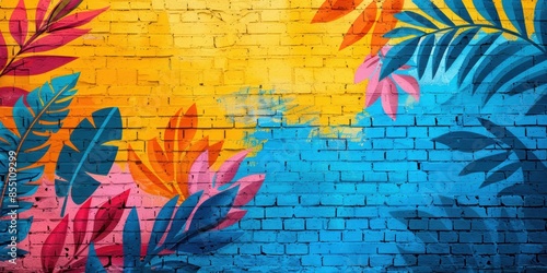 © patungkead, Naklejka premium An artistic digital representation of a colorful graffiti wall featuring bold leaves and vibrant shades of yellow, blue, and pink.