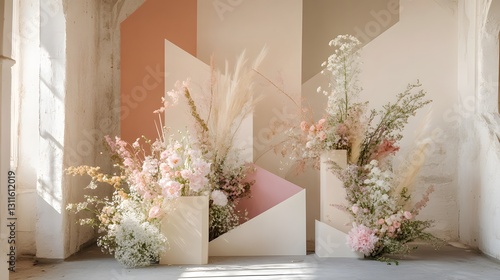 © Mahmulatin, Fototapeta premium An artistic floral display with geometric shapes and pastel colors