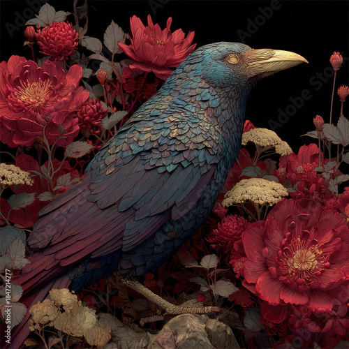 © Evdoha, Obraz premium An artistic illustration of a raven perched among lush red flowers against a dark background