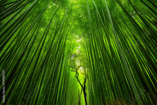 Fototapeta premium An artistic portrayal of a dense bamboo forest, with the slender stalks forming vertical lines that converge towards the top of the frame.