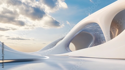 © PondLord, Fototapeta premium An artistic representation of a futuristic building with smooth curves and geometric shapes, emphasizing negative space