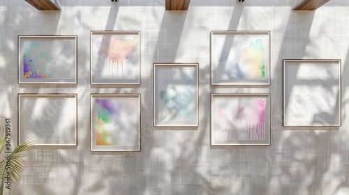 Fototapeta premium An artistic setting with frames designed with a watercolor splash pattern on a textured linen wall, illuminated by natural sunlight filtering through skylights